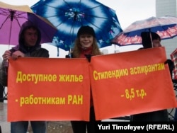 – Я сотрудник Институт физики Земли РАН, ведущий инженер, работаю в институте около 50 лет. Зарплата моя – 13 тысяч 200 рублей, – сообщила корреспонденту Радио Свобода одна из участниц митинга.