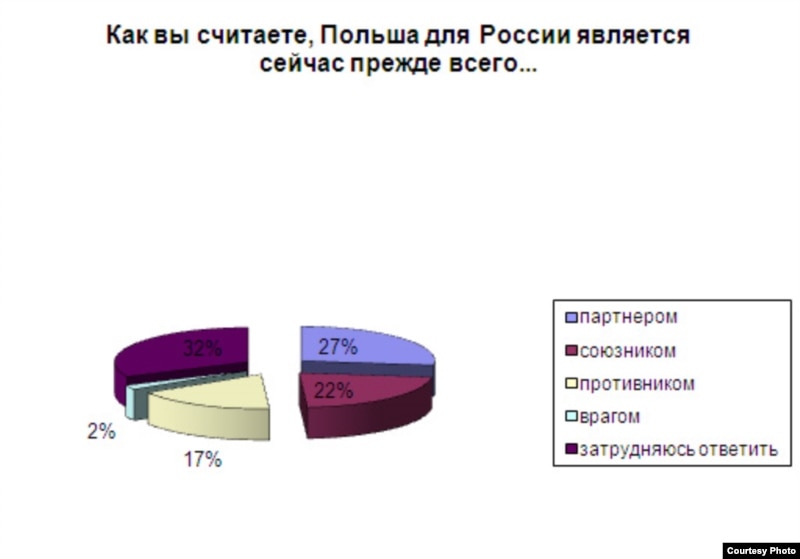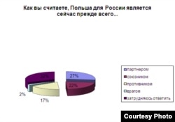 - В целом не очень благоприятно воспринимается Польша российскими гражданами. Она занимает седьмое место в перечне стран, которые россияне считают враждебными по отношению к России: после стран Прибалтики и Грузии. Выяснилось, что партнером Польшу считают 27 %, союзником - 22 %, противником - 17 % и даже врагом - 2 %. Перевешивает, конечно, слегка положительное отношение к Польше, что не мешает ей быть в ряду противников России.