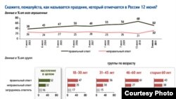 По данным Фонда «Общественное мнение», 32% россиян не знают названия праздника, который отмечается 12 июня, а еще 16% вообще никак не могут ответить на этот вопрос. Собственно, праздником считают этот день только 16% опрошенных, а для 67% это – просто дополнительный выходной. Относительное большинство, 39% респондентов, уверены, что в современной Росси живется хуже, чем в Советском Союзе. Противоположного мнения придерживаются 23% граждан. Главные аргументы последних: сейчас все доступно, нет дефицита и очередей, больше свободы и возможностей, выше благосостояние. Те же, кто полагает, что в СССР жилось лучше, сетуют, прежде всего, на низкий уровень жизни в современной России, дороговизну, рост цен и тарифов, безработицу и отсутствие уверенности в завтрашнем дне. 14% россиян не видят особой разницы между жизнью в Советском Союзе и нынешней, и довольно многие - 24 % - затрудняются с ответом.