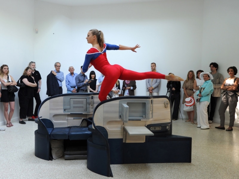 Американский павильон представляют живущие в Пуэрто-Рико Дженифер Аллора и Гильермо Касадилья с проектом “Глория” - художники, известные своими антивоенными работами. Перед павильоном стоит перевернутый американский танк, который меня совершенно поразил своими размерами. По гусенице танка бежит атлет, приводящий ее в движение. Со страшным ревом движутся гусеницы. У Американского павильона выстроилась длинная очередь желающих посмотреть перформансы. Перформансы это - акробатические, гимнастические номера. Снарядами являются сиденья самолетов. Разумеется, - это не сиденья, а скульптуры, изображающие внутренности самолетов. Гимнаст в синем комбинезоне выполняет довольно странные силовые упражнения на снарядах. Все это отсылает к работам Мэтью Барни. Речь идет о демонстрации силы, американских мускулов. Сразу возникают ассоциации с cheerleaders и американскими военными походами последних лет. Внутренности самолетов указывают на экспансии. Еще одна часть американского павильона — это банкомат в виде органа. Когда снимаешь деньги, скульптура благодарит тебя мощным аккордом. Опять же речь идет о мировом господстве. Интересно, что после посещения этой выставки никакого отвращения к якобы мировому господству Америки не возникает. Наоборот — Америка представляется тебе именно той силой, которая необходима для соблюдения баланса в мире!
