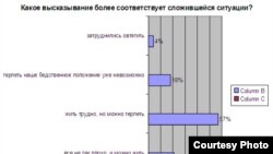 Аналитический центр Юрия Левады регулярно просит россиян оценить свое материальное положение и экономическое положение страны. По последним данным, 13% граждан оценивают материальное положение своей семьи как очень хорошее или просто хорошее, 27% - как плохое или очень плохое. Преобладающая оценка – ее высказали 60% опрошенных – положение среднее. Что касается экономического положения России, то его тоже большинство, 51% респондентов, оценивают как среднее, 8% - как хорошее или очень хорошее, и более трети людей, 37% полагают, что оно плохое или очень плохое. У 4% россиян нет ответа на этот вопрос. Общее настроение подавляющего большинства граждан социологи определяют так: «жить трудно, но можно терпеть», а 18% заявляют: «терпеть наше бедственное положение уже невозможно».