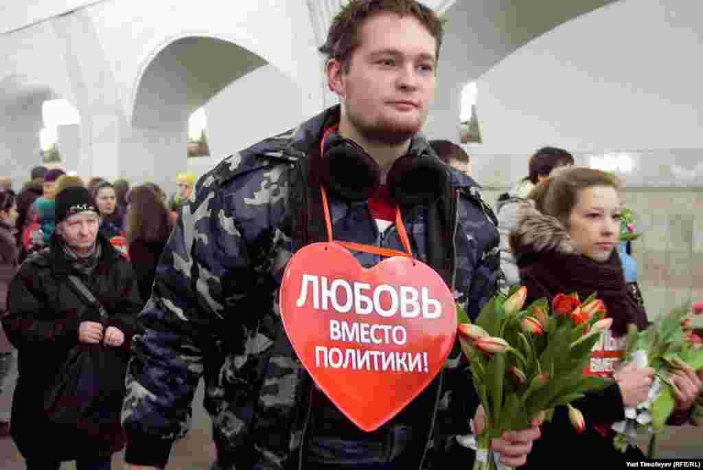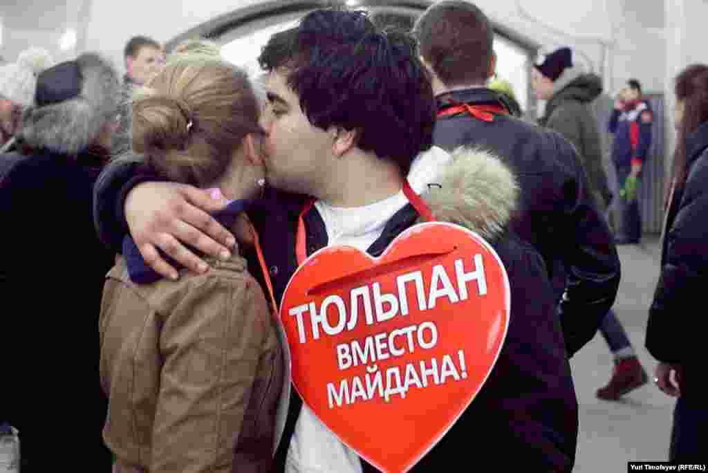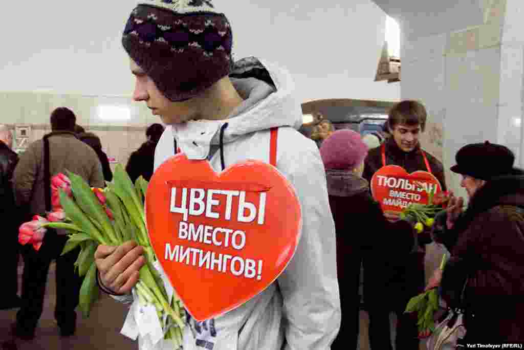 На нескольких станциях метро активисты с табличками: "Весна вместо митингов", "Тюльпан вместо Майдана", "Москва цветам поверит" и "Любовь вместо политики" встречали пассажиров и дарили им букет тюльпанов.