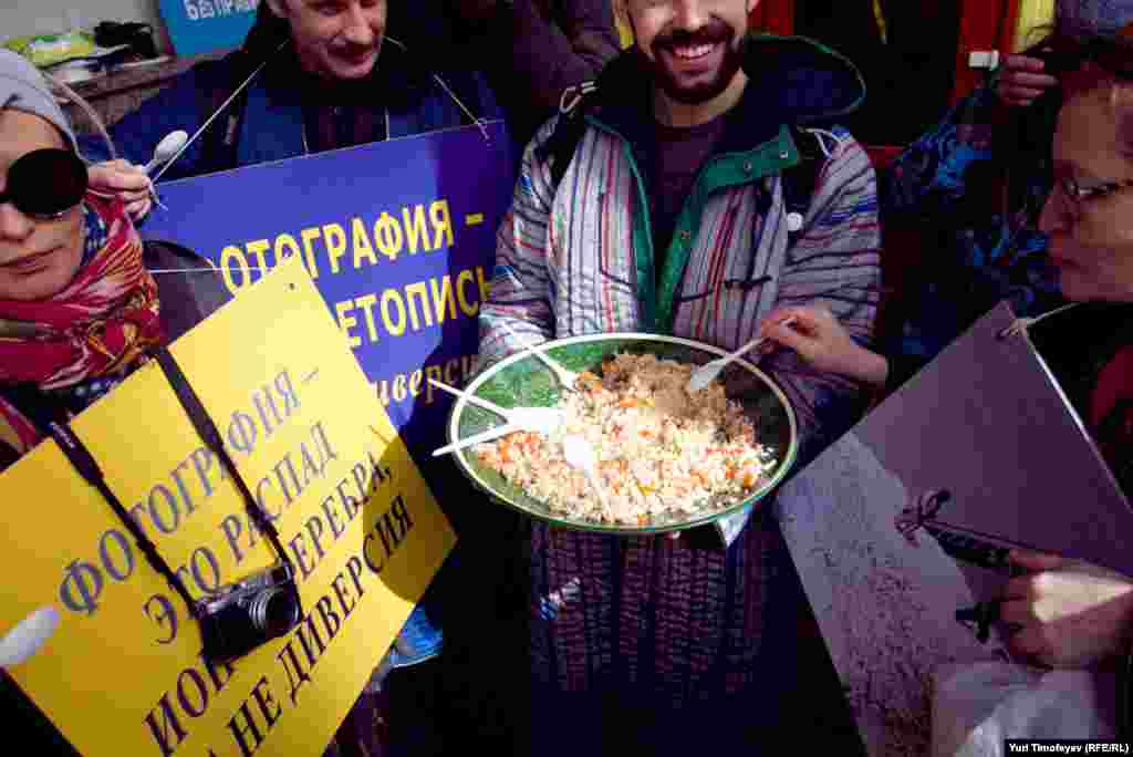 Московские журналисты и фотографы провели у посольства Узбекистана "плов-пикет" в защиту прав фотожурналистов.