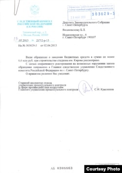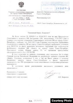 Из Следственного комитета РФ на обращение депутата Бориса Вишневского о хищении 6,6 миллиарда рублей из бюджета Петербурга сообщили о том, что соответствующий запрос направлен в Главное управление Следственного комитета РФ по Петербургу. Из Главного следственного управления по Петербургу сообщили: возбуждено уголовное дело, сведения о разбазаривании и воровстве средств проверяются. Комментировать ситуацию журналистам отказываются, а на самой стройке работает дежурный прокурор.