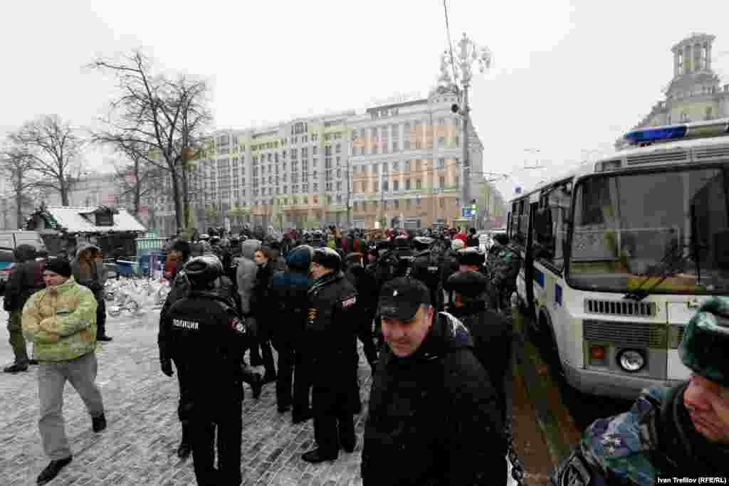В связи с этим группа гражданских оппозиционных активистов попыталась собраться 12 декабря на Пушкинской площади. Полиция их действия пресекла, более 30 человек были задержаны. Среди них члены партии "Яблоко", включая ее лидера Сергея Митрохина, правозащитник Лев Пономарев и журналист Александр Рыклин, а также один из авторов Конституции России, бывший помощник президента Бориса Ельцина Георгий Сатаров.