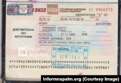 На фото ниже – российская туристическая виза индийского добровольца в "Новороссии" Равиндера Сингха. В Луганскую область Украины Сингх попал через российский пункт пропуска Матвеев Курган. С украинской стороны – пограничный переход Авилово, находящийся под контролем сепаратистов. В Россию, а затем и на Украину Сингх приехал из расположенной в 16 500 километрах Новой Зеландии, где он находился по рабочей визе: