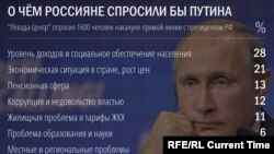 Как сообщил накануне пресс-секретарь президента Дмитрий Песков, среди популярных тем – рост цен, льготы и индексация пенсий, качество образования, борьба с коррупцией, бюрократизмом и кумовством среди чиновников, поддержка малого бизнеса, урегулирование конфликта на востоке Украины, отношения России с США, НАТО и с Западом в целом.