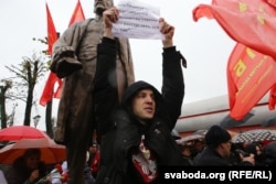 Следом за официальными коммунистами к памятнику Ленину прибыли члены Белорусской партии левых "Справедливый мир". Заместитель председателя организации Валерий Ухналев уточнил: его соратники, в отличие от оппонентов, считают, что в стране у рабочего человека очень много проблем, которые руководство страны не решает.