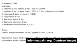 Значительная часть писем от Алексея Муратова посвящена акциям, планируемым пророссийскими организациями в Харькове – например, накануне досрочных выборов в Верховную Раду Украины, состоявшихся 26 октября 2014 года. Как и в "почте приемной Суркова", опубликованной год назад, речь идет в первую очередь о деньгах – активисты на местах присылают план мероприятий и просят выделить им для их проведения бюджет. Вот, например, фрагмент плана акций, присланный Муратовым Ардзинбе в октябре 2014 года. Часть из упомянутых акций состоялась, часть была запрещена украинскими властями – как, например, упомянутый в письме митинг против невыплаты зарплат сотрудникам завода "Турбоатом". В числе "привлекаемых" к акциям харьковских организаций в списке числятся "Женское движение Харькова", "Союз советских офицеров", "Русское вече" и другие, а в качестве одного из организаторов – Александр Петрунько, впоследствии перебравшийся в Россию и, в частности, обвиненный сторонниками Алексея Навального в нападении на политика в мае 2017 года. Общий бюджет пророссийских акций в Харькове за 1 месяц, октябрь 2014 года, если верить приложенной к письму смете, должен был составить 19 200 долларов США. Из них 5000 – в графе с таким названием: "Исполком/МВД (коррупция) оплата охраны митинга силами милиции".