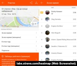 Записанный трек можно проанализировать, узнав, например, какой была средняя скорость, максимальная крутизна подъема на вашем пути и сколько калорий вы потратили, преодолев его. Strava называет себя "социальной сетью для атлетов": можно сравнить свои достижения с достижениями других пользователей на "контрольных" участках – получается своего рода заочное соревнование. Вот, например, как выглядит таблица результатов велосипедистов на Воробьевской набережной в Москве: