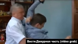 Тогда они отошли от меня к шкафу, где у меня лежат рабочие документы, иконы православные стоят, и оттуда начали записывать репортаж на камеру и при этом начались оскорбления. Ну тут я уже не выдержал, подошел к шкафу, сзади его обнял [репортера] и начал подталкивать к двери на выход. Он рефлективно сопротивлялся и в какой-то момент, может быть ненамеренно, тем не менее, пнул меня пяткой в голень. Стало больно, я просто резко отпустил его, и он упал на пол.