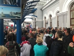 В Севастополе на вокзале огромная толпа: казаки, военные моряки, шарики, обязательный баян, целая толпа собралась на переходе над путями.