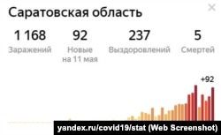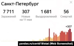 Еще один график (как и предыдущий, он построен Яндексом на основании официальных данных российского правительства) показывает ежедневный прирост новых инфицированных коронавирусом в Курской области. Этот регион не раз назывался российскими экспертами как место частого проявления "электоральных аномалий", когда результаты выборов вызывали подозрения в их искусственной подгонке. С 15 по 25 апреля число ежедневных новых подтвержденных случаев заражения коронавирусом колебалось здесь от 22 до 44 человек в день. 26 апреля был зафиксирован рост заразившихся в полтора раза – 67 человек. С тех пор каждый день это число остается стабильным, не опускаясь ниже 65 и не увеличиваясь больше 74.