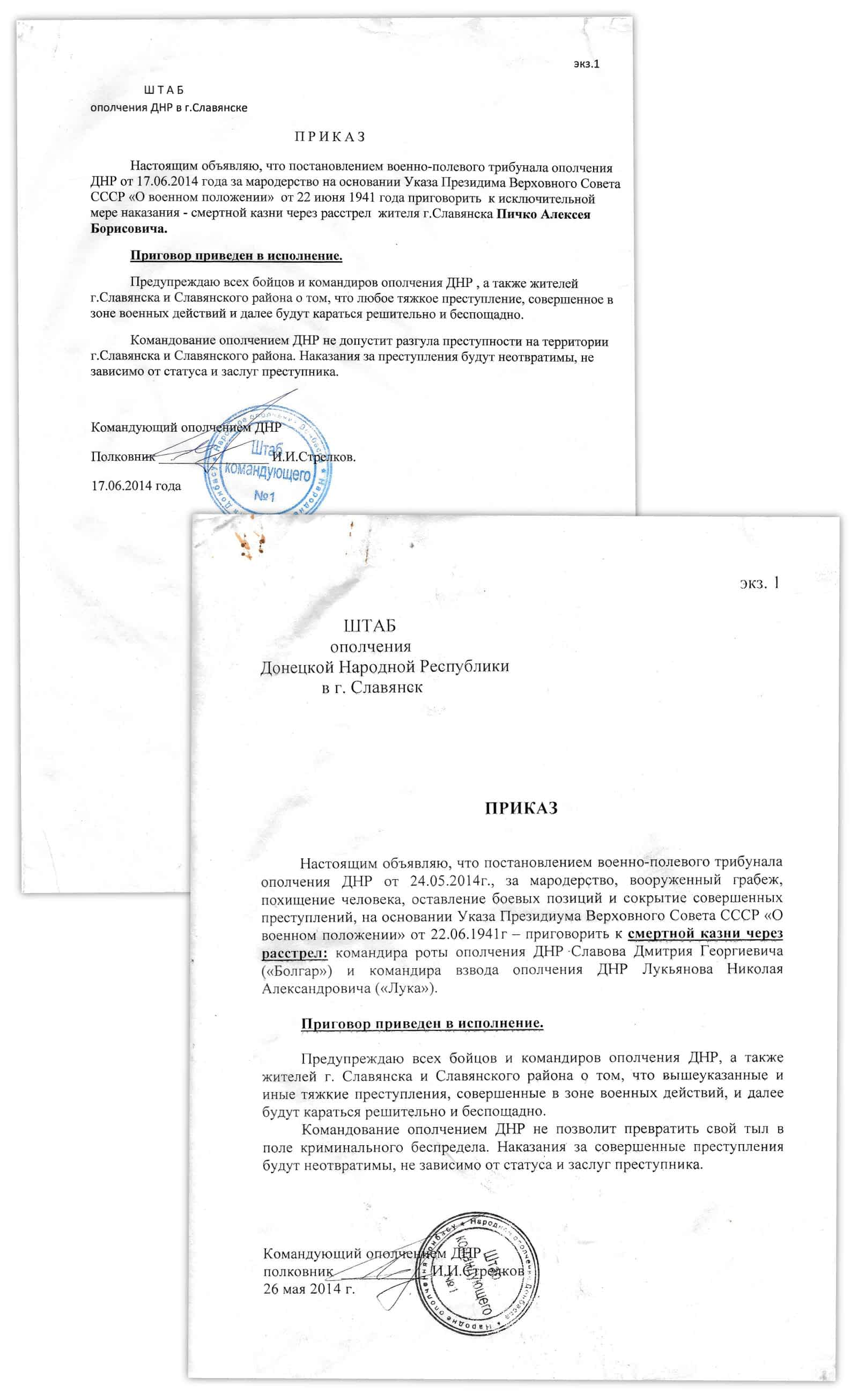 Слева – приказ о казни Алексея Пичко, подписанный Игорем Гиркиным, командующим поддерживаемыми Москвой сепаратистами, захватившими Славянск. Справа – подписанный Гиркиным приказ о казни Дмитрия Славова и Николая Лукьянова.
