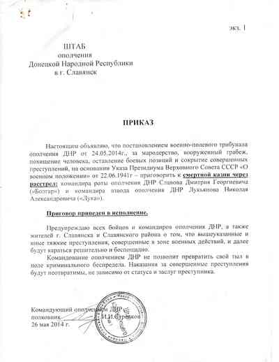 Согласно документам, судьба всех этих троих человек решалась на так называемых "военно-полевых трибуналах", созданных Игорем Гиркиным, бывшим офицером ФСБ, на тот момент более известным как Игорь Стрелков. Юридической базой стал драконовский закон, придуманный Иосифом Сталиным и принятый вскоре после вторжения Германии в Советский Союз в ходе Второй мировой войны. Указ Президиума Верховного Совета СССР от 22 июня 1941 года, на который ссылался Гиркин, предусматривал смертную казнь – Украина отменила ее в 2000 году, в России на нее с 1996 года действует мораторий. К смертной казни приговаривали за преступления, которые Гиркин называл "тяжкими", при этом под ними понимались и мелкая кража, и убийство.