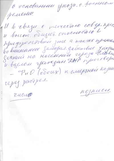 Варвара Пахоменко, глава украинской миссии правозащитной организации "Женевский призыв", которая занимается защитой прав гражданского населения во время вооруженных конфликтов, изучила документы из Славянска. Говоря в целом о внесудебных расстрелах в зоне боевых действий, он отметила в беседе с Радио Свобода, что "смертная казнь допустима лишь в исключительных случаях и лишь за очень серьезные преступления при условии проведения честного и независимого суда".