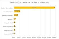 Ранее в оппозиционных СМИ и телеграмм-каналах обнародовались данные проведенных ими опросов у избирательных участков, дававших прямо противоположные результаты: от 60 до 70% голосов за Тихановскую, от 16 до 22% – за Лукашенко. Работа независимых социологов в Беларуси давно затруднена.