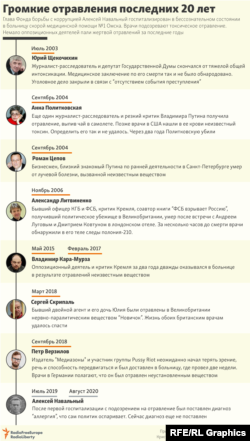Навальный заявлял, что ранее у него ни на что аллергии не было и что его могли попытаться отравить. Он подавал заявление в Следственный комитет. Проверка ни к чему не привела. Позже Навальный, рассуждая о возможном преступлении против него, напомнил о случаях отравления политиков, активистов и журналистов, а также бывших сотрудников спецслужб – Юрия Щекочихина, Анны Политковской, Александра Литвиненко, Сергея и Юлии Скрипаль, Петра Верзилова – и о подозрениях в причастности российских властей к этим отравлениям.
