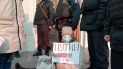 Анастасия Гордиенко из Омска пришла с плакатом "Путин убийца". Её уронили, когда ОМОН стал пододвигать людей, но она снова встала в пикет.
