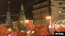Очередную годовщину Октябрьской революции коммунисты отметили в пятницу массовым шествием в центре Москвы. По завершении сбора на Пушкинской площади участники акции двинулись по Тверской, на Театральной площади у них запланирован митинг и концерт. Народу собралось очень много, представляется, что организаторы выполнили свое обещание привести пять тысяч сторонников. Очень много милиции ОМОНа, я насчитал порядка 40 автомобилей.