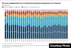 "На первый взгляд в отношении россиян к войне мало что меняется, поскольку сохраняется информационная блокада, – отмечают ученые, – то есть существует цензура, не пропускающая сколько-нибудь достоверной, объективной, критической информации о положении дел в зоне военных действий и в приграничных регионах. Явно наблюдается дефицит общей информации. Поэтому в целом на поверхности соотношение мнений почти не меняется: сейчас 76% в совокупности поддерживают военные действия – 46% говорят "определенно поддерживаю" и еще 30% – "скорее поддерживаю".