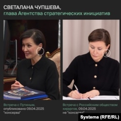 В 2025 году Чупшева дважды участвовала в съемке "консерв", которые вышли в апреле и сентябре. В первую из этих двух встреч она посещала Кремль в черном жакете с золотистыми пуговицами. Точно в такой же одежде в день публикации "консервы" она появилась на совещании правительства и на подписании договора с Российским обществом хирургов.