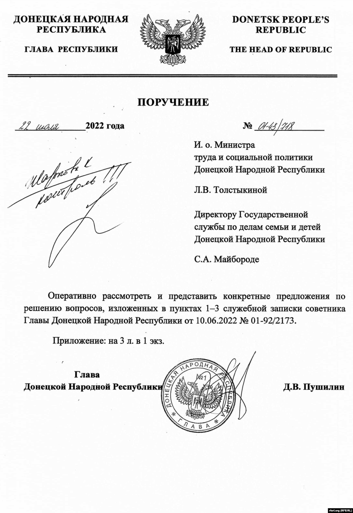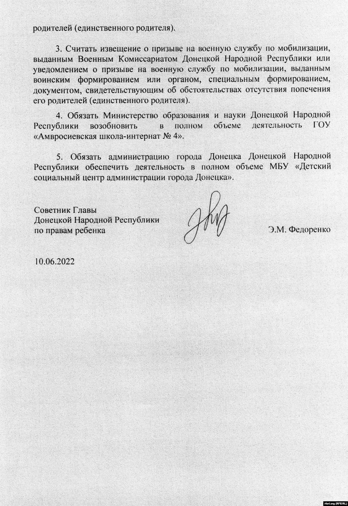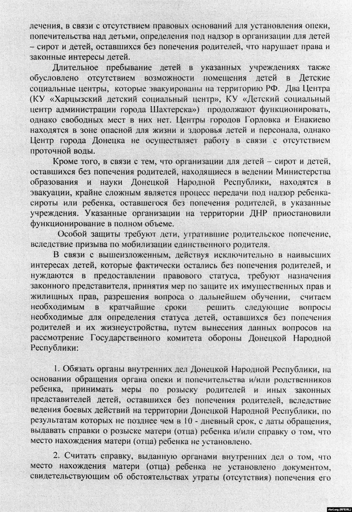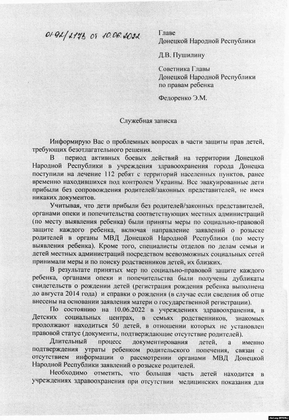 В июне 2022 года советник главы "ДНР" по правам ребенка Элеонора Федоренко отправила главе "ДНР" Денису Пушилину служебную записку (есть в распоряжении "Системы"). В записке предлагалось в десятидневный срок присваивать детям, не имеющим родителей, статус "оставшихся без попечения". Фактически это должно было значить, что если дети и родители потеряли друг друга в сумятице войны, то органы опеки отдают поиск родителей на откуп местных органов внутренних дел. И если те за 10 дней не находят родителей, то детей можно отдавать в "новую", российскую, семью.