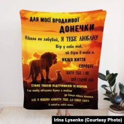 Мой муж, когда попал в Бахмут... Он чувствовал, что уже не вернётся. Он подарил ей одеялко – там был нарисован большой лев и львёнок, а моя доченька – она лев по гороскопу. Он никогда в жизни не дарил ей таких вещей: он мог подарить велосипед, самокат, телефон, но что-то такое никогда не дарил. Он заказал, находясь в Бахмуте, этот плед. Плед привезли прямо на день рождения Веронички – второго августа. На нём было написано: "Я не могу пообещать, что я буду с тобой до конца твоей жизни, но я обещаю любить тебя до конца своей".