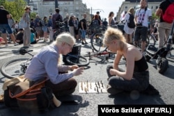 Велокурьеры играют в шахматы и блокируют движение на мосту Маргит в Будапеште 18 июля, протестуя против изменения упрощенного налогового режима. Критики решения утверждают, что изменения нанесут ущерб малому бизнесу и затронут сотни тысяч людей. Фото – Ворос Силард, RFE/RL.