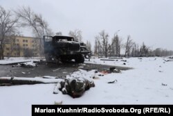 Сгоревшая российская установка залпового огня "Град" и занесенное снегом тело убитого российского солдата под Харьковом 25 февраля. Автор снимка – Марьян Кушнир, украинская служба Радио Свобода/Радио Свободная Европа.