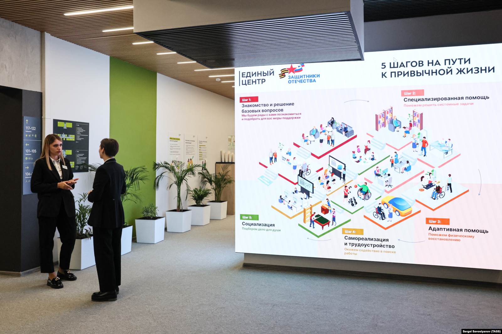 Третьего апреля 2023 года (больше года прошло с начала войны) президент Путин подписал указ о создании Государственного фонда поддержки участников "СВО" "Защитники Отечества". К этому времени московский Единый центр работал уже больше месяца и успел принять более 3,5 тысячи обращений ветеранов. Тем не менее московский Единый центр, рассказывают его сотрудники, стал региональным филиалом фонда "Защитники Отечества" и получил в нагрузку военно-патриотический логотип государственного фонда, филиалам которого в других регионах предстояло открыться только 1 июня.