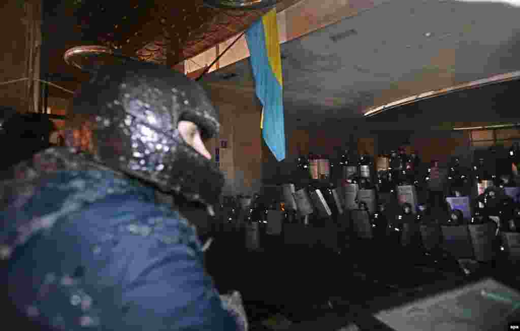 Милиция покидает Украинский дом после того, как сторонники оппозиции захватили здание.