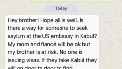 "Привет, братишка! Надеюсь, у тебя все хорошо. Есть способ хоть кому-то сейчас попросить убежища сейчас в американском посольстве в Кабуле? С моими мамой и подружкой все будет хорошо, но брат в опасности. Визы никто не выдает. Если они возьмут Кабул, то пойдут от двери к двери, разыскивая всех, кто работал на правительство.