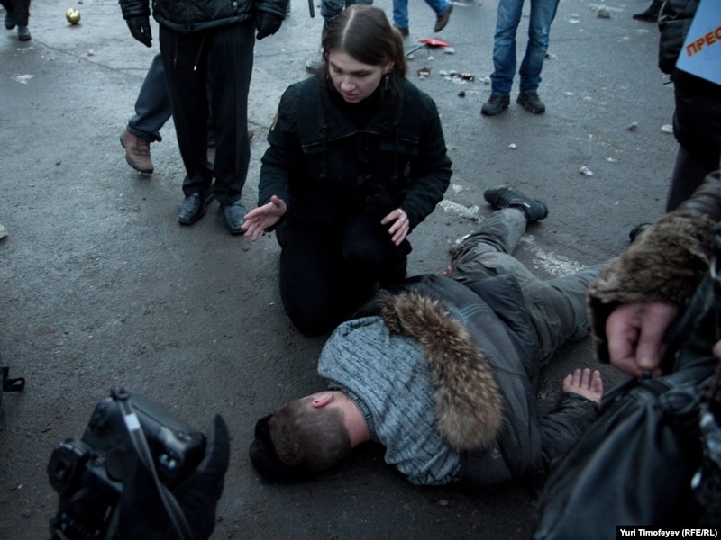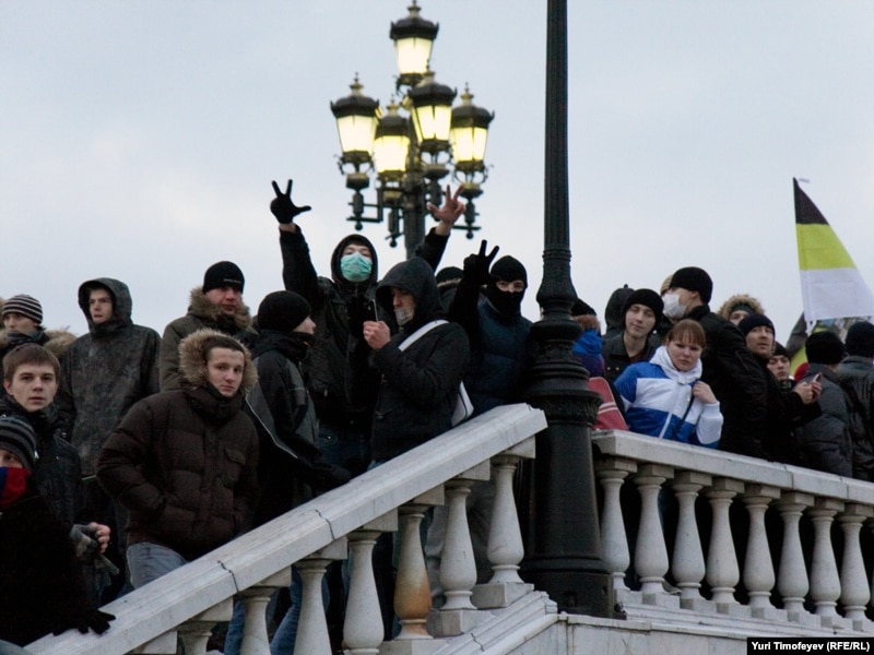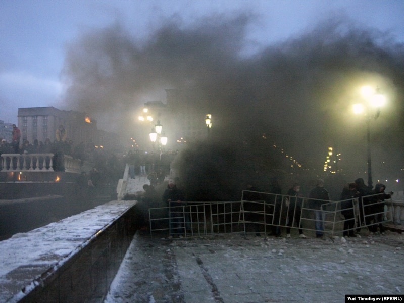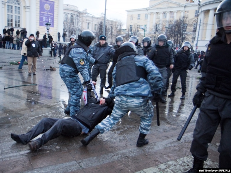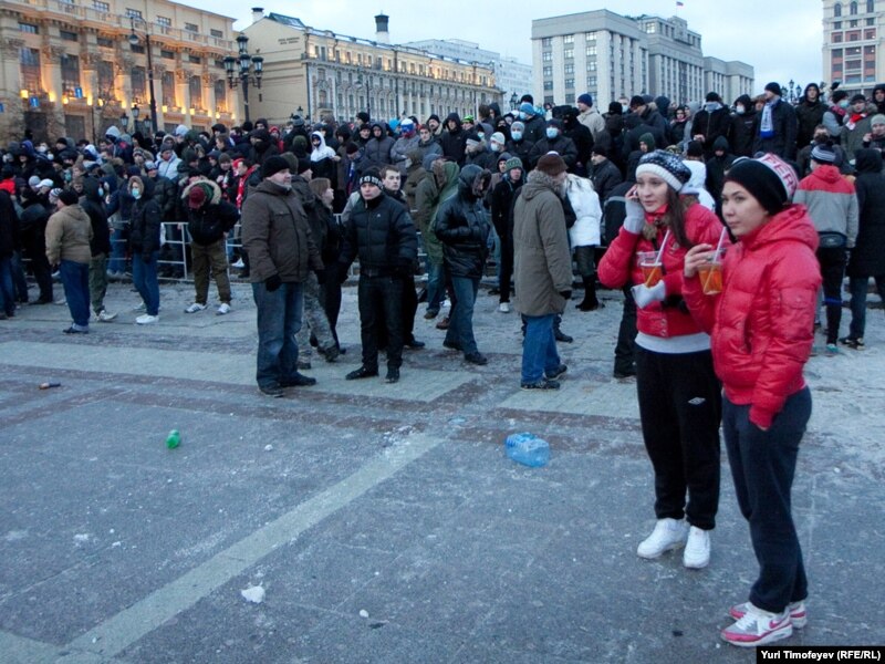 Корреспондент Радио Свобода работал на Манежной площади, где футбольные фанаты, пришедшие с акции памяти убитого Егора Свиридова, устроили погром. Движение на Моховой улице было полностью перекрыто. Сообщения о том, что идет бой между ОМОНовцами и агрессивно настроенной толпой, не подтвердились. Однако толпа спустилась в метро, где стала нападать на граждан с кавказской внешностью.