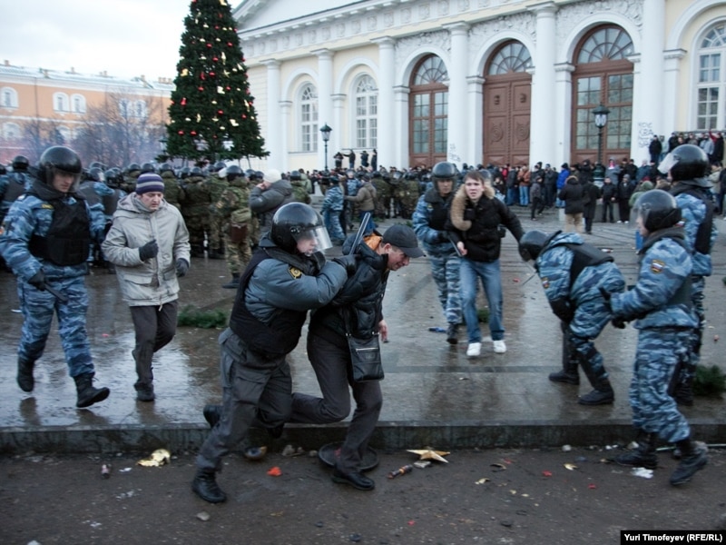 Общее же число футбольных фанатов в центре Москвы – около 3000 человек. Они разгромили огромную новогоднюю елку, установленную на площади и стали забрасывать сорванными с нее игрушками омоновцев. Время от времени в воздух взлетает ракеты, слышны взрывы, по всей видимости, от петард. Все вокруг оцеплено милицией, общее число стражей порядка около 500. По громкоговорителю они призывают собравшихся не поддаваться на провокации и обещают, что зачинщики погромов понесут наказание. ОМОН выдавливает фанатов в сторону метро, в ответ в них летят ледышки и петарды.